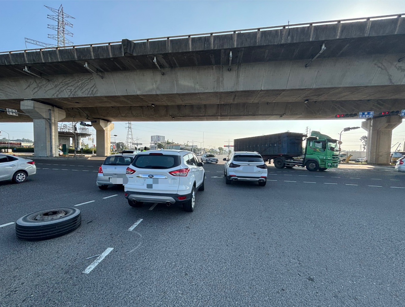 ▲ ▼才剛下高速公路!拖車輪胎"自己掉下來" 砸中3車.(圖/警方提供)
