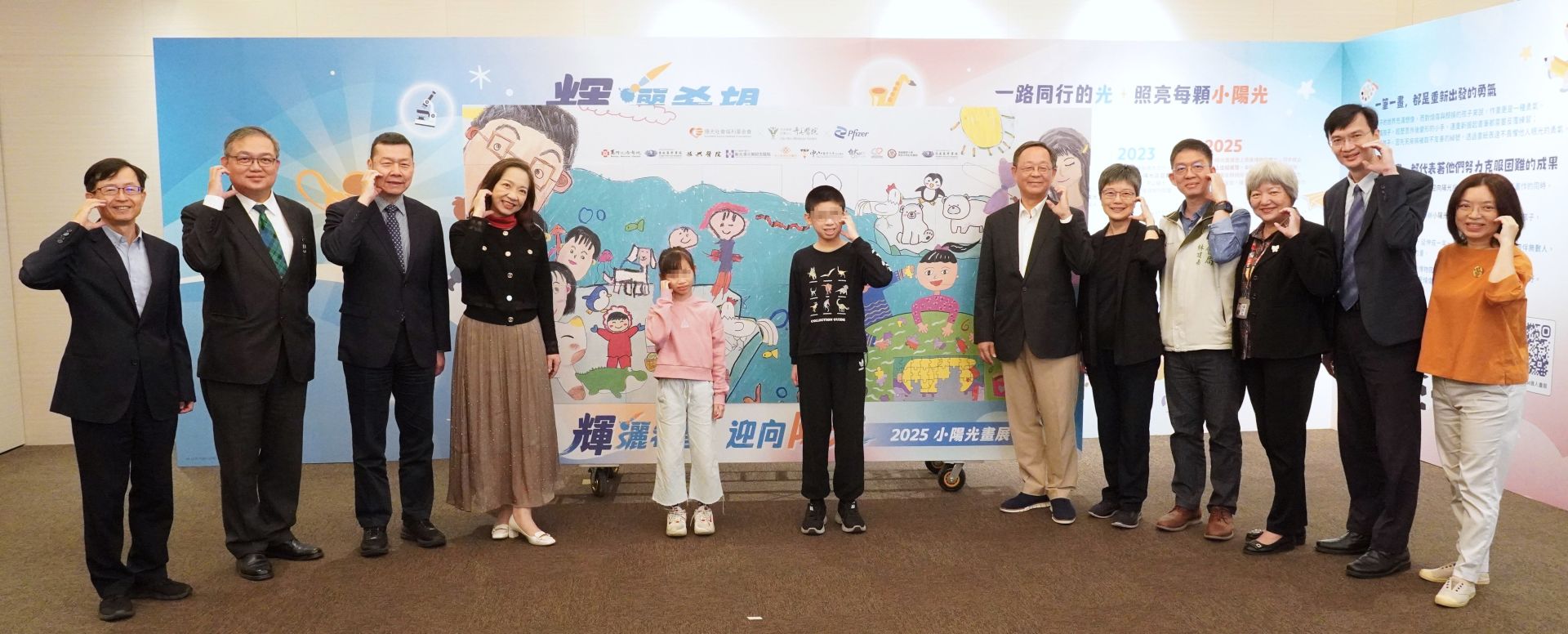 十二片拼圖匯聚完成,象徵『2025陽光小畫家畫展—輝灑希望.迎向陽光』的精神正式啟動,主辦單位代表、貴賓與兩位小陽光畫家合影,共同見證希望與勇氣的綻放