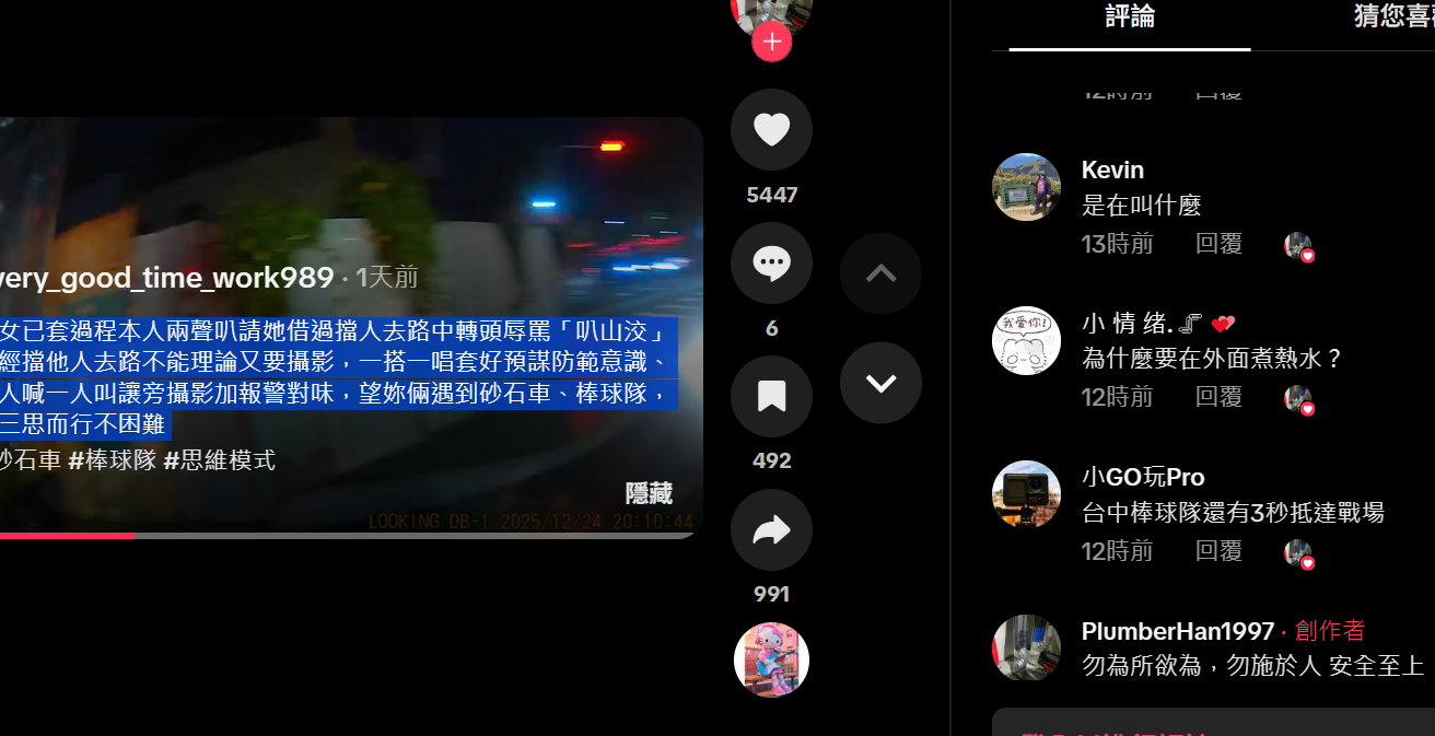 日前抖音上有人上傳一段行車糾紛影片(https://www.tiktok.com/@every_good_time_work989/video/7587604074594454805?_r=1&_t=ZS-92VlMeIoYGO),聲稱在路上遇到一對母女擋路,他叭兩聲要求借過,但對方轉頭辱罵「叭山洨」,認為這對母女擋人去路,還拿手機攝影,根本是一搭一唱套好,最後還詛咒母女遇到砂石車、棒球隊,沒想到影片PO出後,雖然有人提醒「動手就不對」,但也有人嘲笑小朋友「在叫什麼」、「為什麼要在外面煮熱水」。
