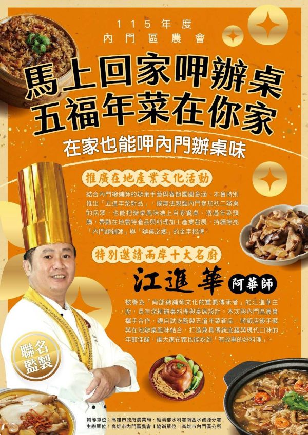 【視傳媒記者吉雄世高雄報導】素有「台灣總鋪師故鄉」美譽的高雄市內門區,每逢春節大年初二舉辦的「回娘家呷辦桌」活動,長年為全台年節指標盛事。為迎接 2026 年春節,高雄市政府農業局輔導內門區農會,除延續廣受歡迎的實體辦桌外,更首度推出多款外帶年菜新品,打破時間與空間限制,讓民眾在家也能品嚐道地的內門總鋪師手路菜。內門「初二歡喜回娘家 駿馬奔騰呷辦桌」活動即日起接受預訂(訂購專線:07-6672161、6673737),數量有限,欲購從速。
