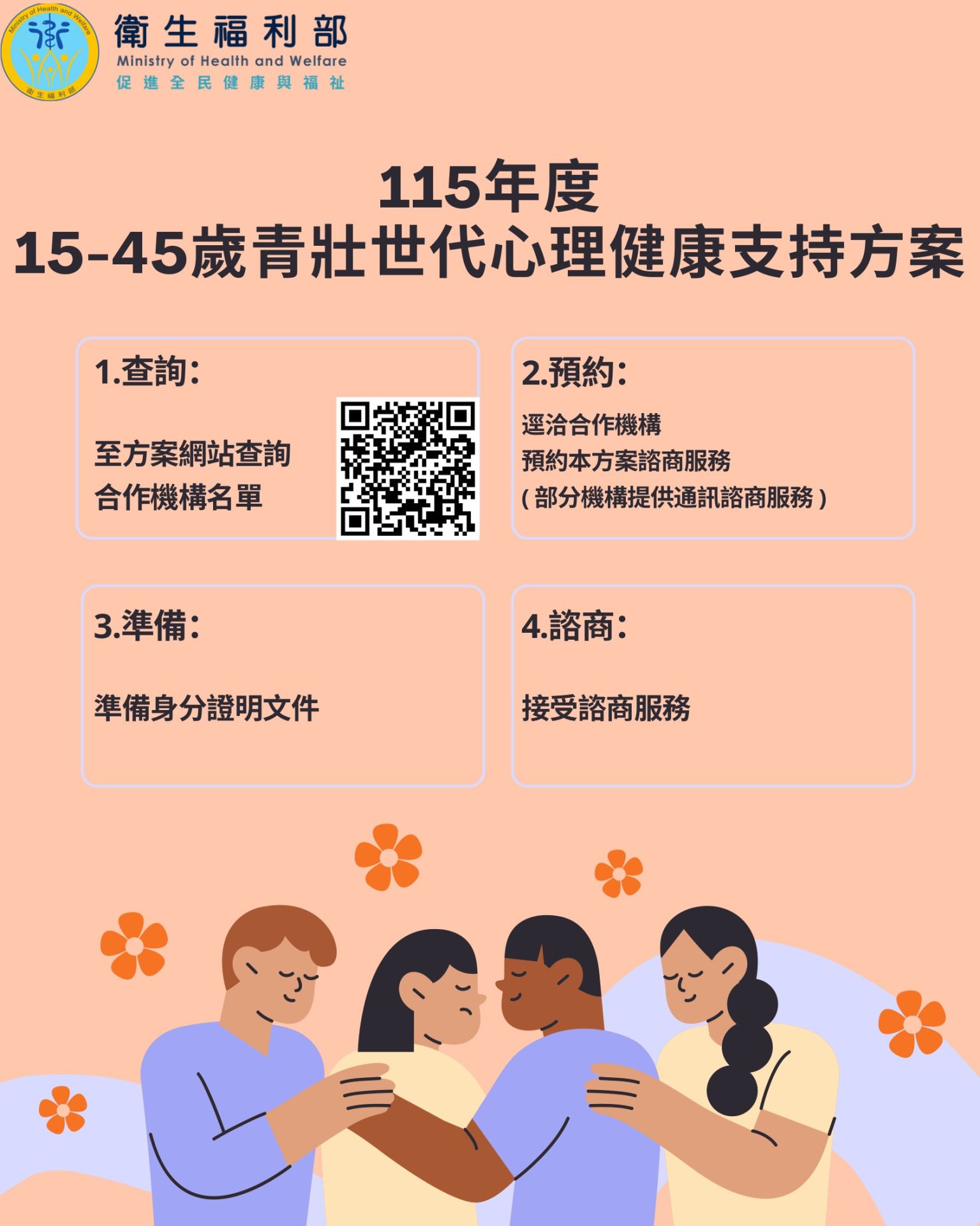 衛生局表示,衛生福利部今年下半年將試辦「癌友心理支持方案」,提供癌友及其家屬最多12次免費的心理支持方案,最快於7月上路,先期將以肺癌、頭頸癌、乳癌病友為主,而考量其他癌別患者也有需求,計畫上路後只要經醫療團隊評估後,認定有心理諮商需求者,便可加入計畫。