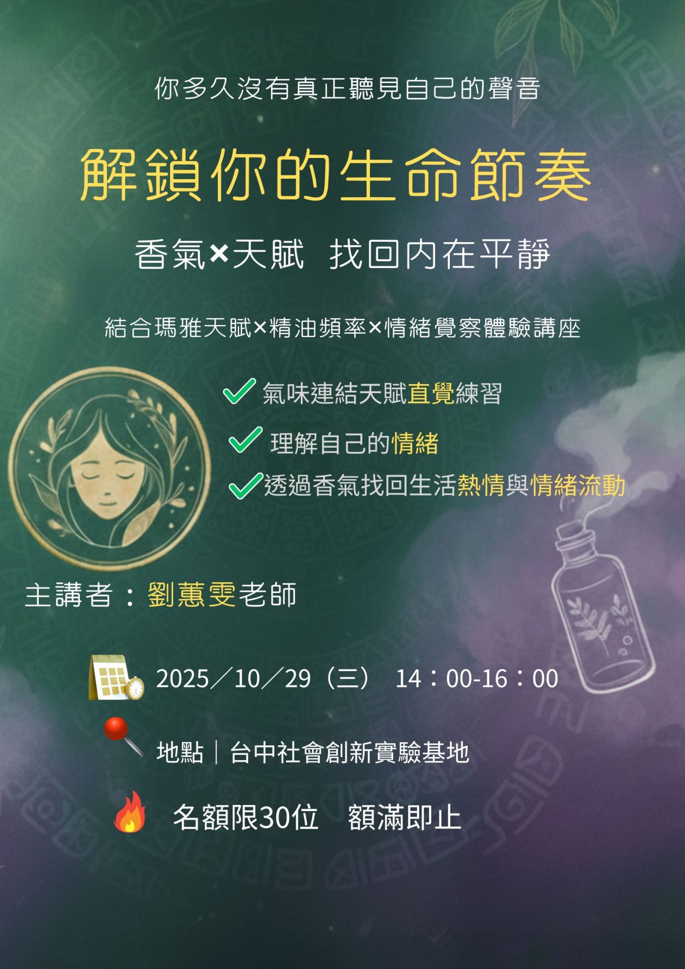 在高壓與快速變動的時代,許多人在忙碌之間逐漸失去了「內在平衡」。為幫助現代人重拾生活節奏,樂業國際事業有限公司將於 10月29日(週三)下午2點至4點,在 臺中社會創新實驗基地7樓思想廚房 舉辦「香氣解密 × 天賦覺醒——找回你的生活節奏與內在平靜」講座。