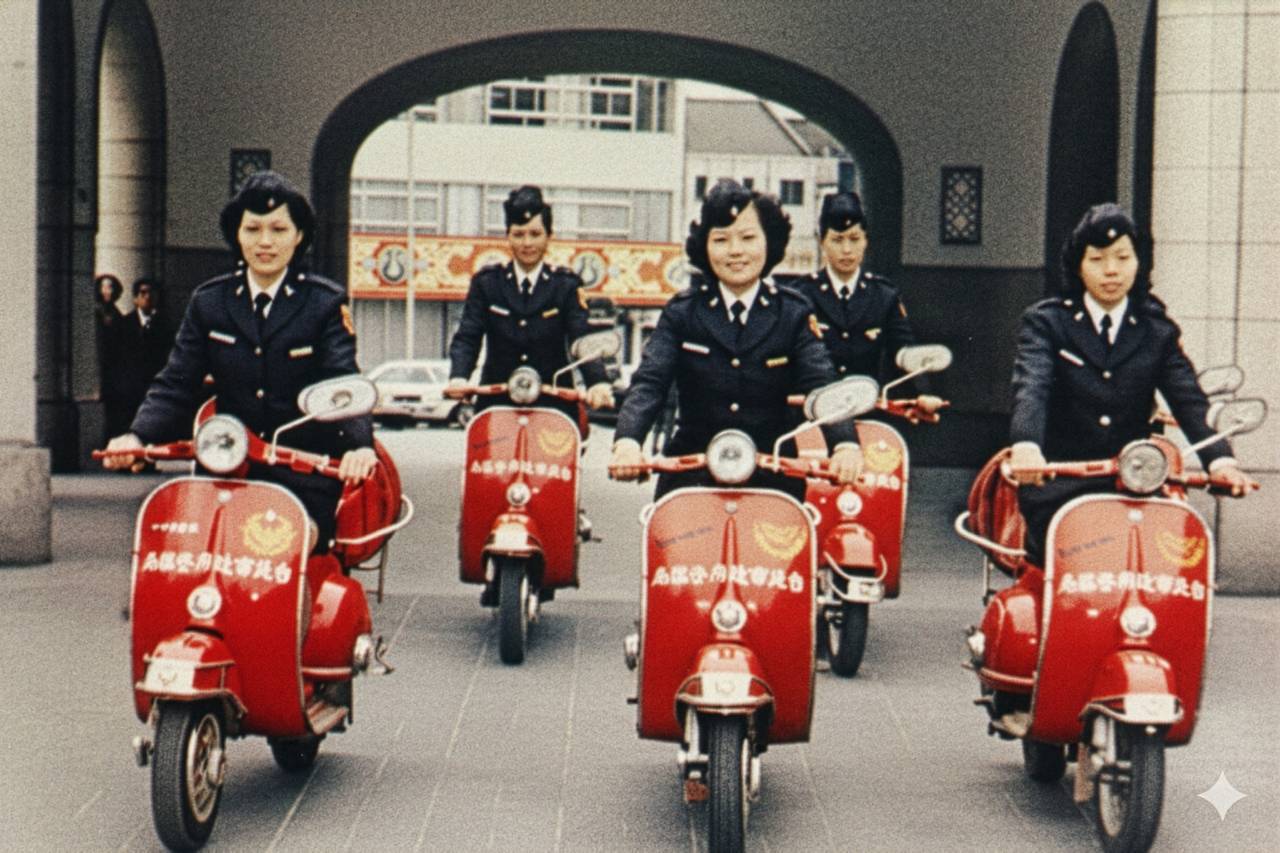 九十七歲攝影大師周鑫泉警察紀實作品展28 日亮相新北雙和藝廊。圖為女警車巡於台北市中山堂前,警徽不同。(警光雜誌222期封面照 64.01.01警政文庫提供)
