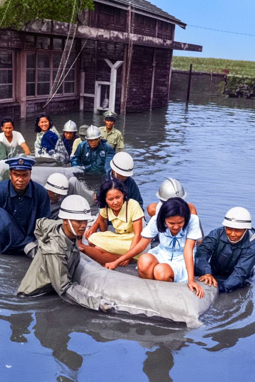 八一七嘉南地區豪雨成災警察同仁涉水搶救受災婦孺(警光雜誌230期 封面照64.09.01警政文庫提供)