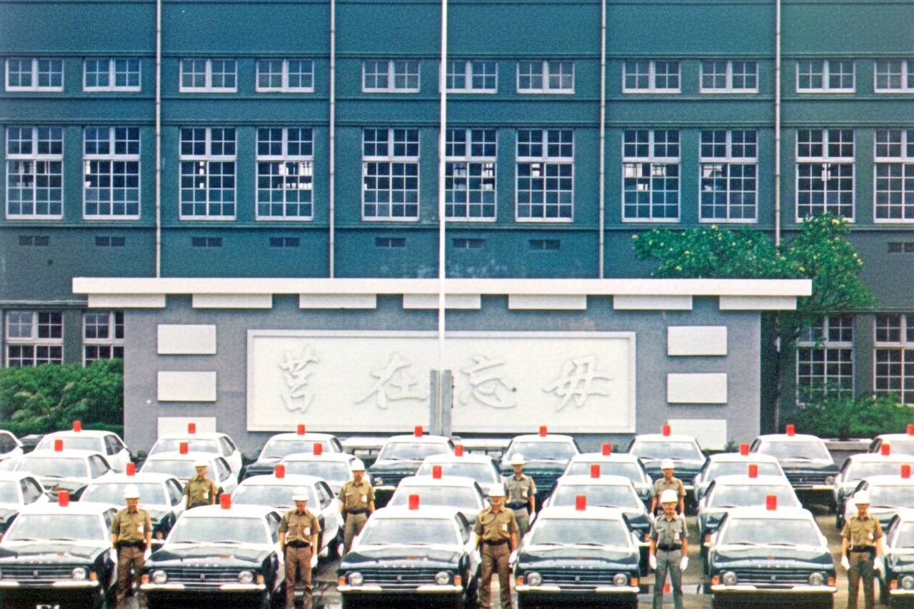 七月一日起全國警用巡邏車改為黑白兩色大批新車在警政署操場整裝待發福特跑天下1.6巡邏車(警光雜誌216期封面照 63.07.01警政文庫提供)
